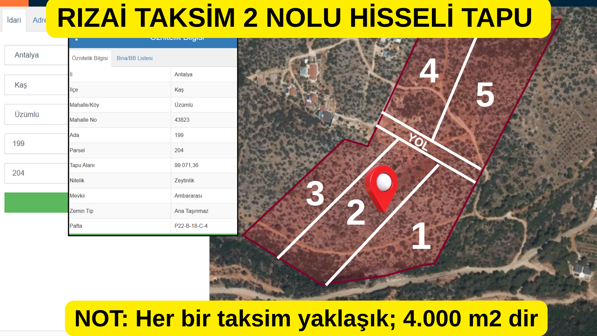 NOT-1: 5 HİSSEDAR OLARAK EŞİT OLARAK RIZAİ TAKSİM SÖZLEŞMESİ YAPILMIŞ OLUP, HER BİR TAKSİM ORTALAMA 4.000 m2 DİR